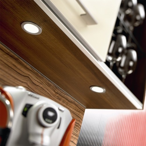 For temperature-sensitive applications in furniture, wood and laminates, Hera introduces the new LED recess spotlight, the KB 12 LED. Equipped with a 24 ultra long life LEDs with a total capacity of 1.6 Watts, this spotlight provides "cool" lighting conditions every time. With a recess diameter of 55 mm and a minimal recess depth of 16 mm, it can be fitted flush into 19 mm thick panels. The unit connects directly to a 24V D.C. power source which ensures easy and fail-safe installation. Ensure that vacant slots on the panelboard are not fitted with short circuit plugs.