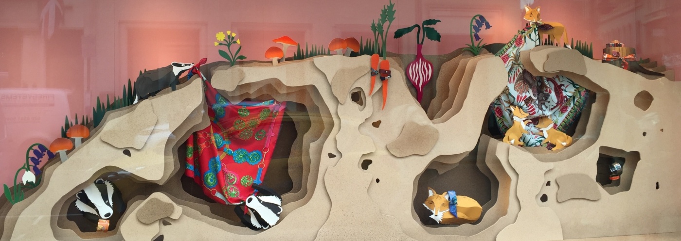 My favorite among all of the window displays: even though the merchandise at Hermès clearly takes a backseat to the badger sett and foxhole, the multilayer construction and the loving details truly deserve praise! Even the bracelets love their vegetables ...