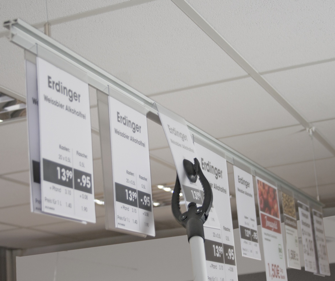 The ceiling system is perfect for use in all large-scale sales areas where you wish to suspend information or prices from the ceiling, e.g. beverage stores, supermarkets, DIY stores and garden centres. It consists of a specially designed aluminium rail with matching poster displays. The combination enables price or promotional posters to be changed quickly and easily. The pick&change poster displays are simply clipped into the pick&change rail where they hang down vertically. No more hooks, eyes or other components are required to install or change the poster displays.
