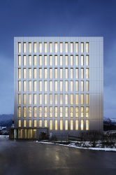Inside the building, one can see the supporting structure made of timber; the external façade is clad in aluminium. The prototype was opened in 2012 and is mainly used for office purposes. For the LCT One, Zumtobel has developed an integral lighting concept including lighting management, emergency lighting and alternative lighting solutions for the offices. Apart from the modern and perfectly glare-free office luminaires as well as energy-saving LED corridor lighting, Zumtobel's Luxmate Litenet lighting management system is used in the LCT One. It controls the lighting, emergency lighting and blinds.
