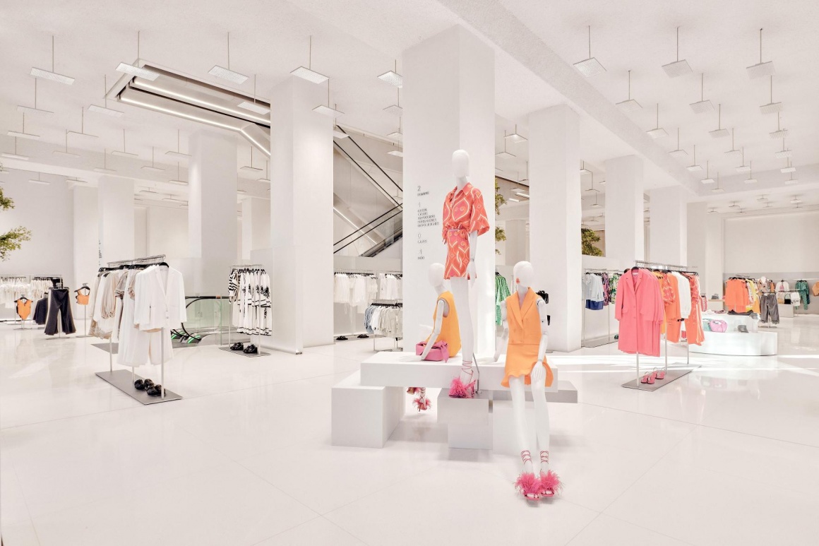 With more than 7,700 m2 of floor space and 3,815 m2 of retail space, the new store displays women's, men's and children's fashion collections on four floors in an architectural concept produced entirely by the Zara Architecture studio. The interior space has been designed as a large, clean and neutral container with coloured textiles and furniture to shine the spotlight on the fashion on display.