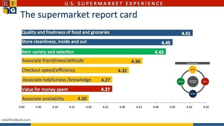 - Quality/Cleanliness: Supermarket shoppers rated quality/freshness of the food and groceries (4.51) followed by cleanliness of the store (4.45) as the two highest-rated core experience factors.